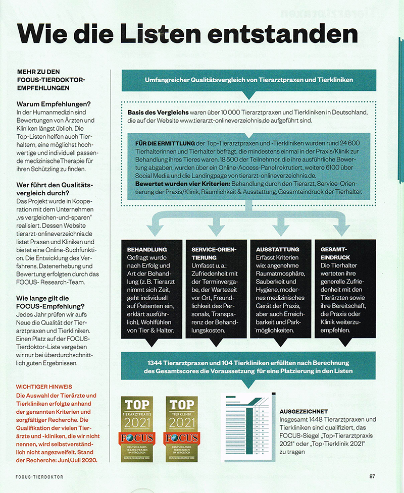 “Den richtigen Tierarzt in Ihrer Nähe finden Sie in unseren aufwendig erstellten Listen mit 1448 empfehlenswerten Praxen und Tierkliniken (ab Seite 86). 25 000 Tierhalterinnen und Tierhalter aus ganz Deutschland haben mit ihrem ausführlichen Urteil über Kriterien wie Behandlung, Freundlichkeit, Service oder Ausstattung zur Entstehung der Listen beigetragen.” (C) Focus Tierdoktor Gesundheit für Ihr Tier Nov. 2020 |